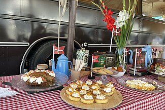 Rugbrødslagkage/Brødtort, sandkage, "Kys og Klap" - er kun en lille del af det klassiske sønderjyske kaffebord. Holdet fra Café Krusmølles kagebus kom forbi med de traditionelle kager, tærter og bagværk og gjorde dagen med gratis smagsprøver af det sønderjyske kaffebord blev det til en ’historisk fejring’, som var arrangeret af "Blomster bygger broer".